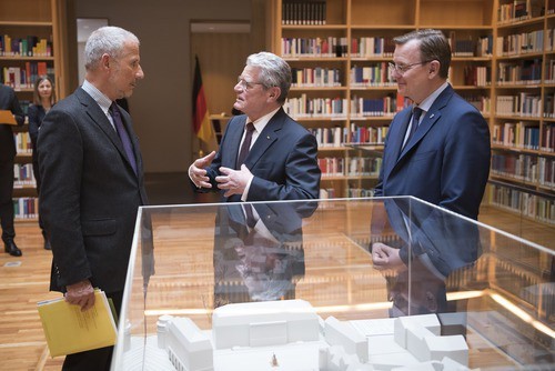 Weimar, Februar 2017: Bundespräsident a. D. Joachim Gauck trifft und dankt Hans-Hinrich Dölle für sein Engagement mit Pro Helvetica in Weimar. Mit dabei Thüringens Ministerpräsident Bodo Ramelow, rechts im Bild.