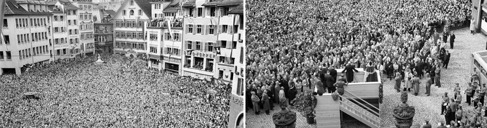 Bild: Der Münsterhof als lebendiger Mittelpunkt der Stadt Zürich - gestern und heute. Die historische Aufnahme entstand anlaesslich der Europa-Rede Winston Churchills am 19. September 1946.